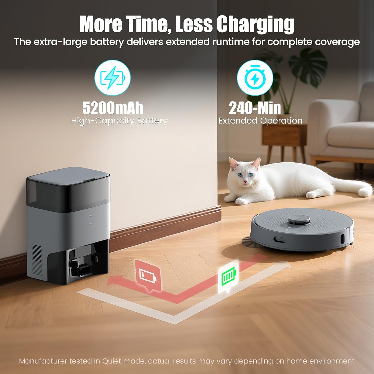 - [60 Tage Freihändig]: Der Saugroboter mit Absaugstation verfügt über einen 3,5L Staubbehälter, der automatisch Schmutz sammelt. Dadurch können Sie bis zu 60 Tage lang das Leeren des Staubbehälters vermeiden. Ideal für vielbeschäftigte Familien und Haustierbesitzer.