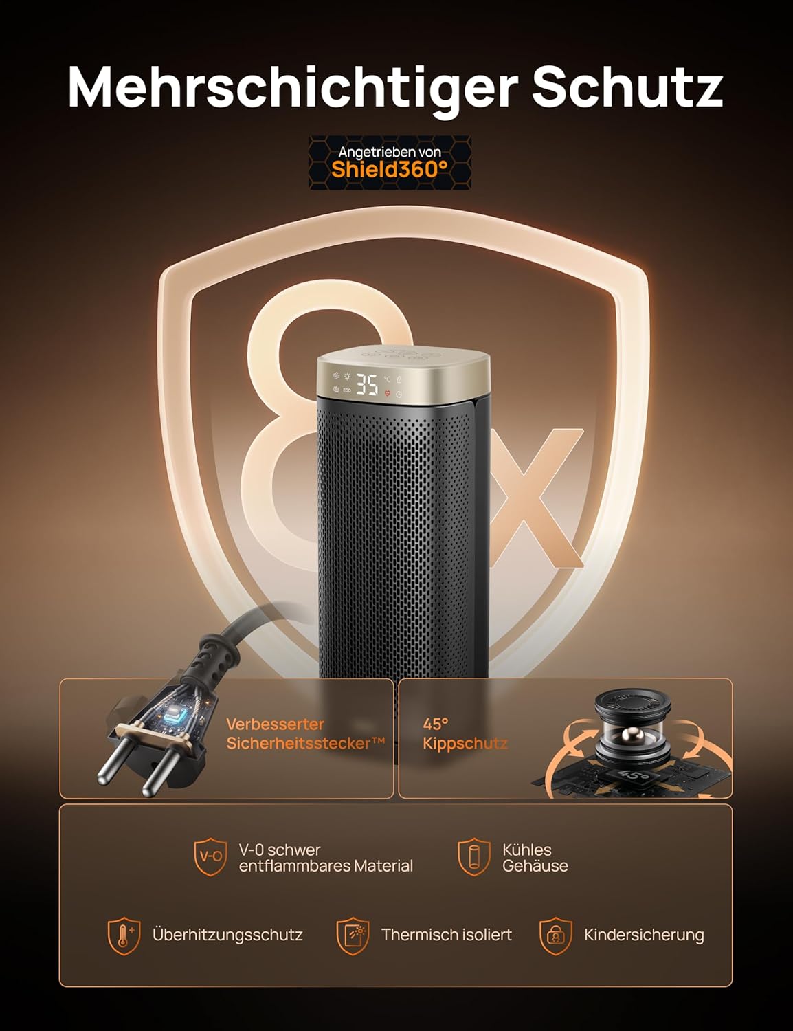 - Unübertroffene Sicherheit und Zuverlässigkeit: Genießen Sie höchste Sicherheit mit diesem Innenheizgerät, das über einen Shield360°-Schutz, Kippschutz und Überhitzungsschutz, eine 24-Stunden-Auto-Ausschaltfunktion und V-0 flammhemmende Materialien verfügt. CE-gelistet für Ihr beruhigtes Gewissen.