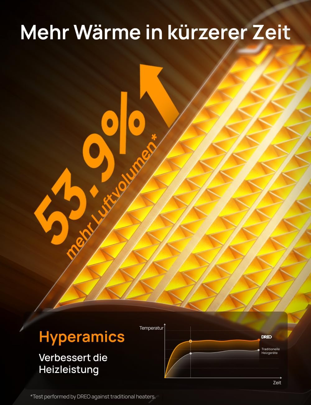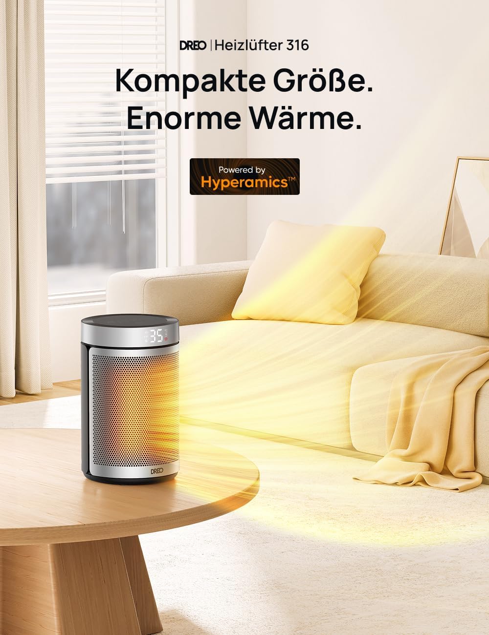 - Starke Wärme, die überall passt: Dreo Heizlüfter für Innenräume kombiniert Hyperamics 1500W fortschrittliches PTC-System mit einem neuen Wärmetrichter-Design, um Wärme innerhalb von Sekunden zu liefern und die Warmluftzirkulation für eine bis zu 200% größere Reichweite als herkömmliche Heizungen zu verbessern.