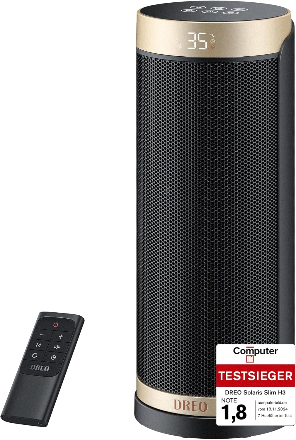 Dreo Heizlüfter Energiesparend, PTC Keramik Heizlüfte Leise, 70° Oszillierend Elektroheizung mit Fernbedienung, 12-Std-Timer, 3 Modus 3 Geschwindigkeit, Überhitzungs-Kippschutz, Solaris Slim H3