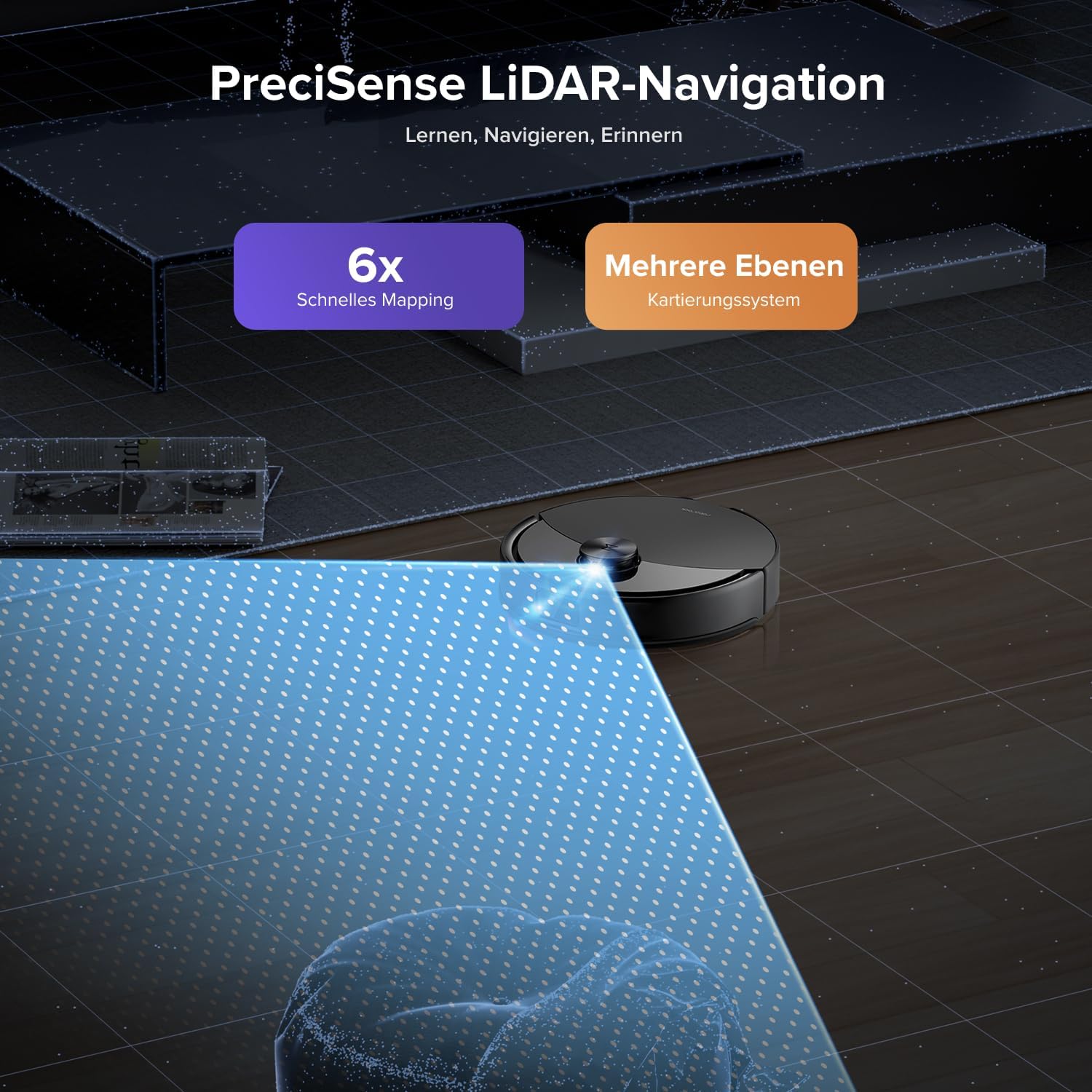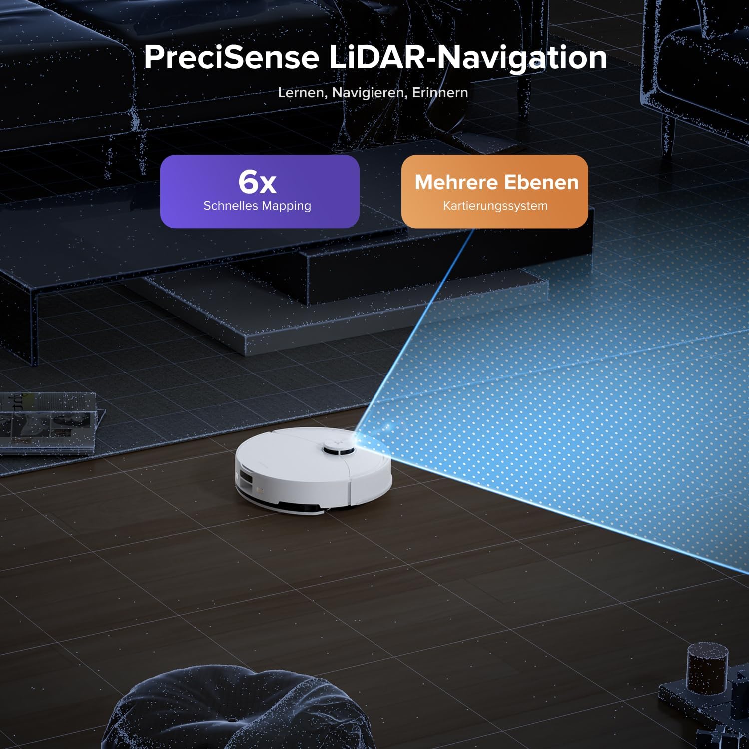 - PreciSense LiDAR Navigation: Das LiDAR-basierte System scannt 360°, um hochdetaillierte Karten zu erstellen und unterstützt Multi-Level-Mapping für eine effiziente Navigation über verschiedene Etagen. Genießen Sie die präzise Routenplanung für eine schnelle, genaue und gründliche Reinigung in jedem Winkel Ihres Hauses.