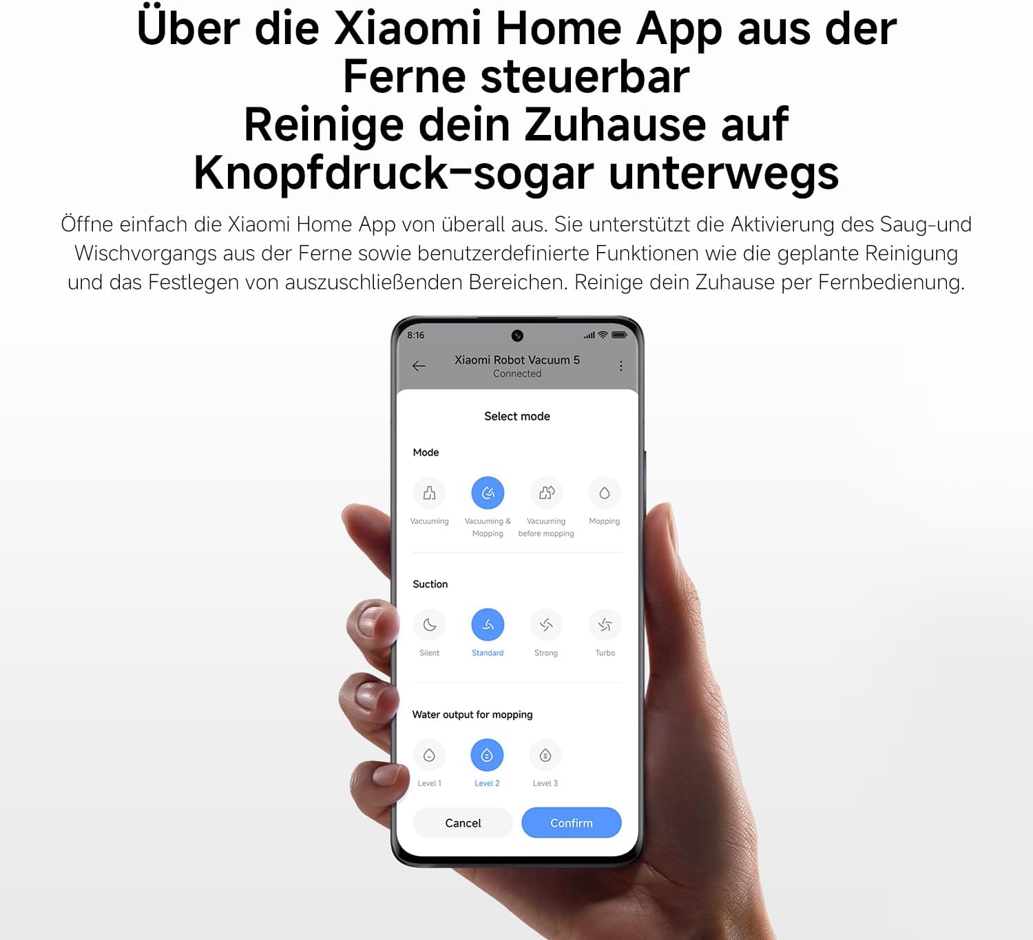 - [Intelligente Xiaomi Home App-Steuerung] Zeitschaltung und Automatisierung von Reinigungsprozessen via der smarten Xiaomi Home App. Wahl zwischen 4 verschiedenen Reinigungsmodi (z.B. zuerst saugen, dann wischen), einstellen von No-Go-Zonen und genaue Programmierung für alle Räume